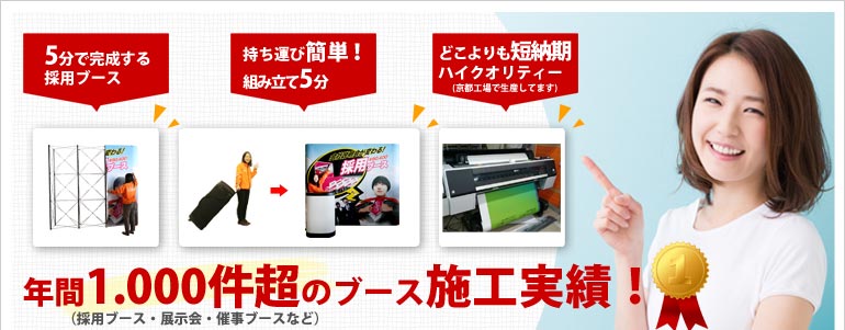 タペストリーを壁に掛けるだけで、あっという間に壁一面が広告に早変わり。驚きの簡単施工!たった3枚のタペストリーで、ブースが劇的に変わります。